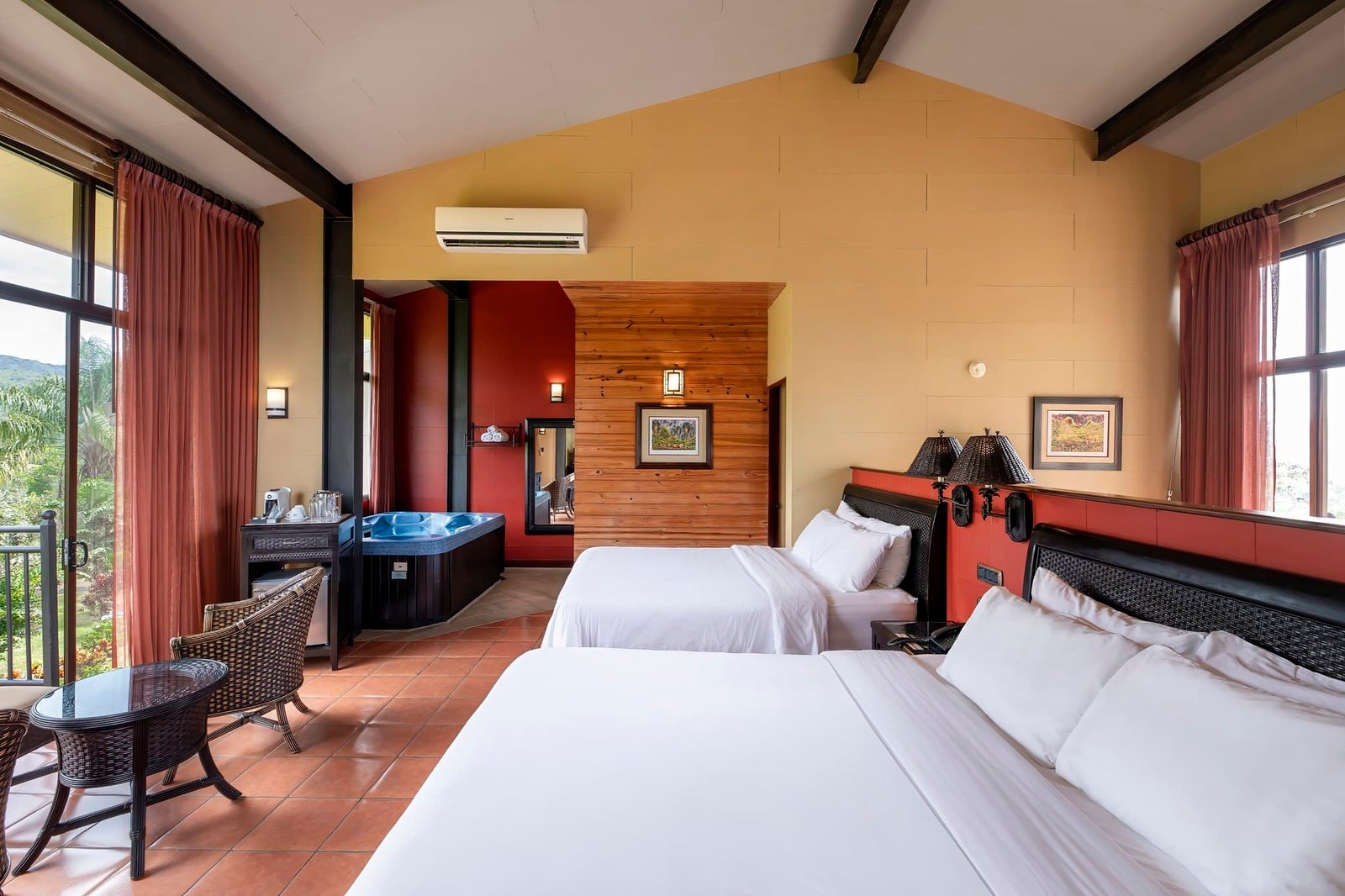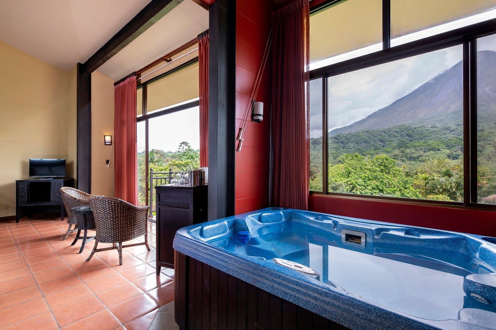 King-size bed, jetted tub, and two Juliet-style balconies with breathtaking Arenal Volcano and garden views.